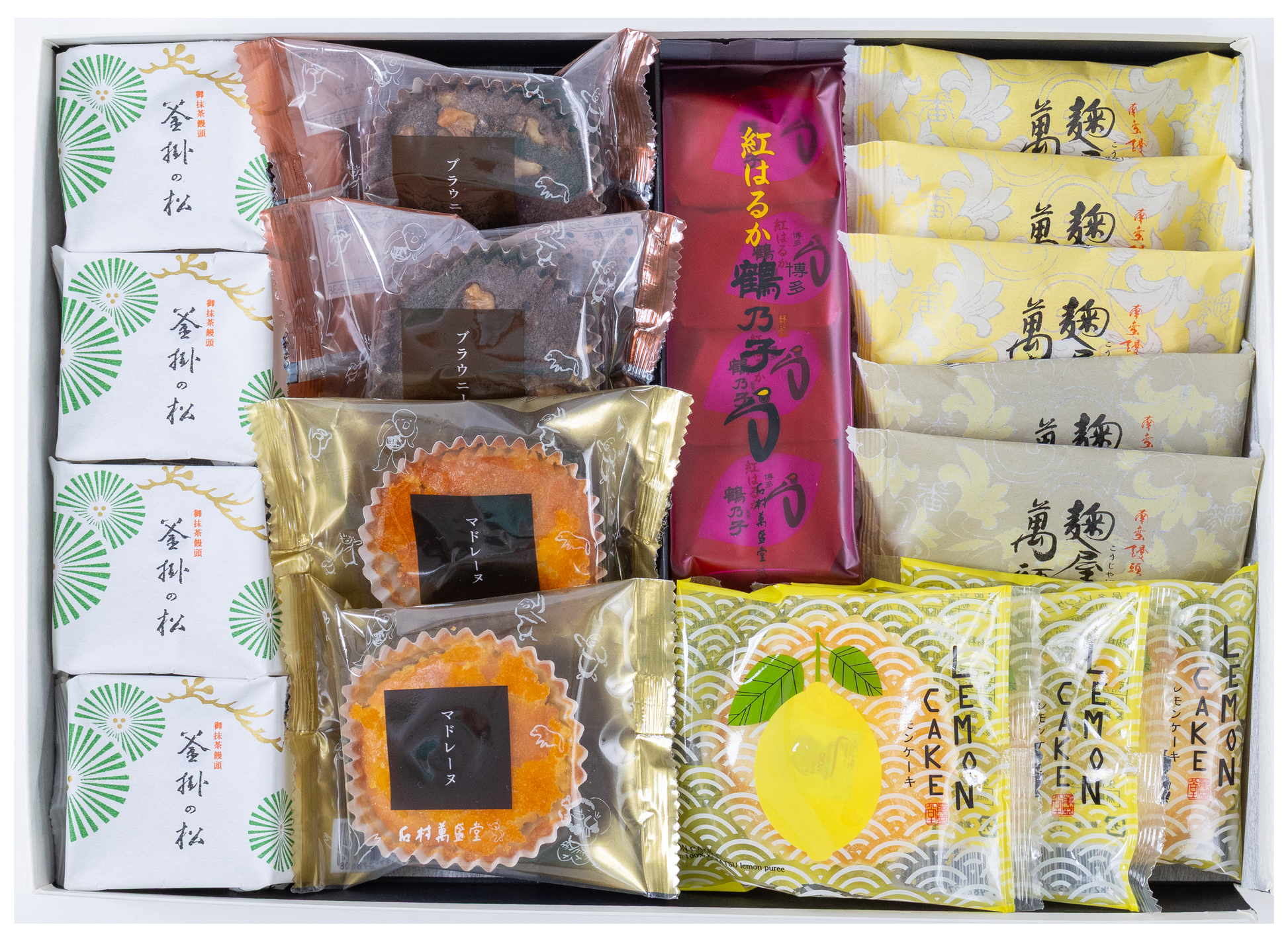 釡掛けの松4個、マドレーヌ2個、ブラウニー2個、麹屋番萬頭(ミルク3個・ココア2個)、レモンケーキ3個、季節鶴乃子4個入